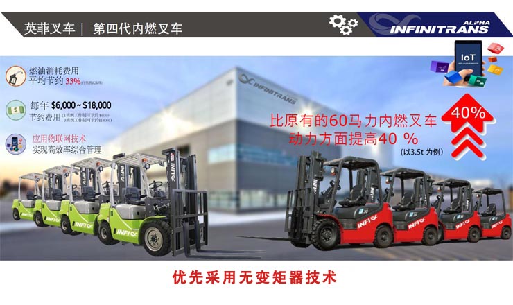 一、相比市場上同噸位內(nèi)燃叉車,英菲叉車動(dòng)力提升40%,燃油節(jié)省33%